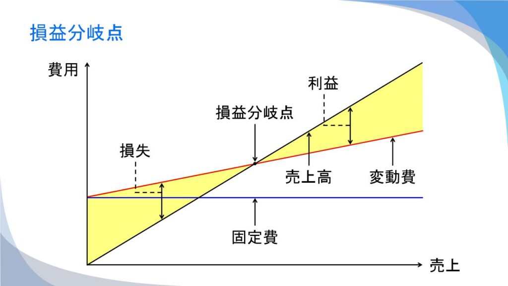 損益分岐点とは「売上高 = 総経費」であり、利益がゼロの状態です。