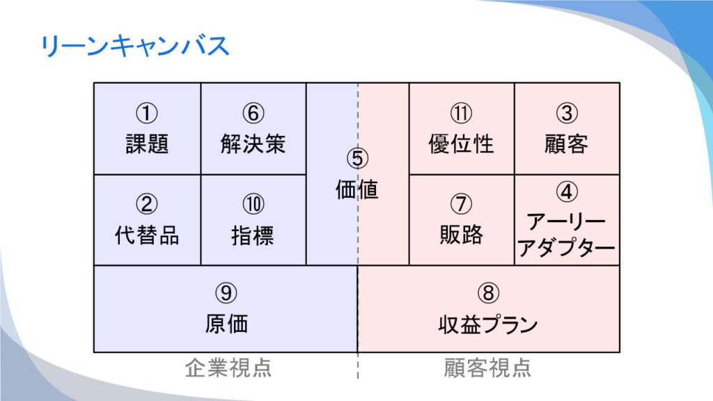 リーンキャンバスとは、新しいビジネスの「発想」や「リスク」を発見できるフレームワークです。